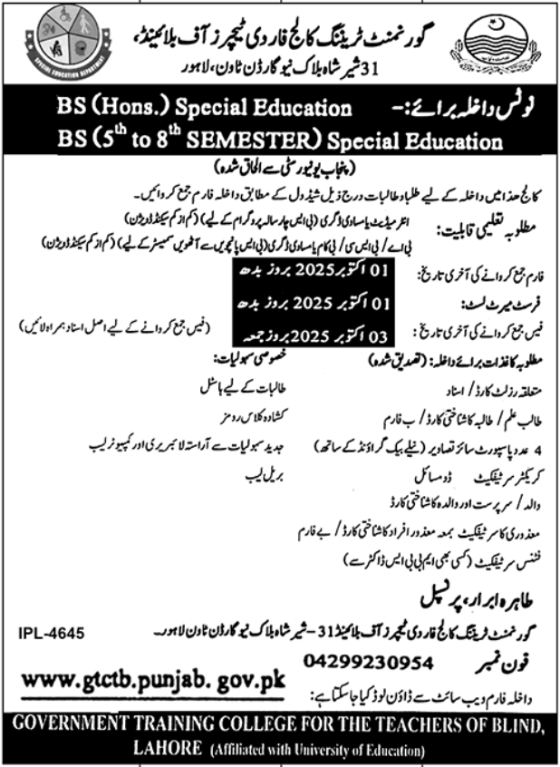 The Government Training College for the Teachers of the Blind, Lahore invites applications for admission 2025 to the following degree programs in Special Education: