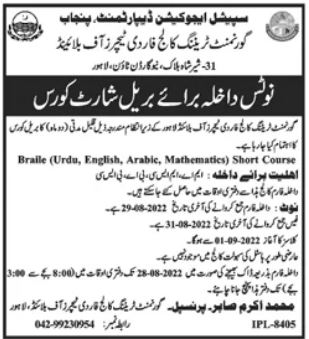 Government Training College For the Teachers of Blind GTCTB Lahore is seeking applications from interested candidates for granting the GTCTB Admissions 2022. GTCTB Courses Admissions 2022 are advertised for the aspirants in languages of Braile, Urdu, English, Arabic, Mathematics. Candidates who have passed BSc, BA, MA, MSc education are allowed to avail GTCTB Lahore Language Courses Admissions 2022. Applications must be reached on or before August 29, 2022 and last date for submission of fee is August 31, 2022. Government Training College For the Teachers of Blind Admissions 2022 are ongoing.
