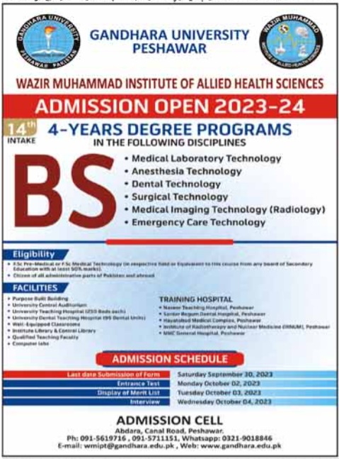 Gandhara University, situated in Peshawar, Pakistan, is welcoming aspiring students to be a part of its educational journey for the academic year 2023-24. The Wazir Muhammad Institute of Allied Health Sciences, affiliated with Gandhara University, is offering admission to a diverse range of four-year degree programs across various disciplines.