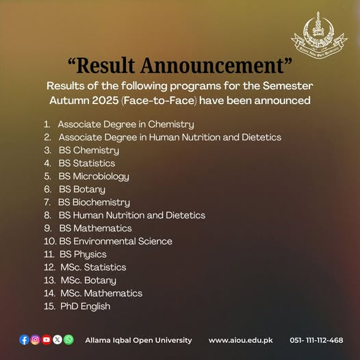 Allama Iqbal Open University AIOU has officially announced the results for various academic programs for the Autumn 2025 Semester. This announcement specifically targets students enrolled in Face-to-Face F2F programs, ranging from Associate Degrees to PhD levels. The university continues its tradition of timely academic cycles, allowing students to transition smoothly into the Spring 2026 semester.