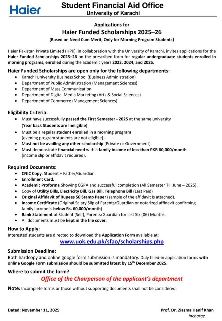 Haier Pakistan Private Limited is the private business company, which is contributing in the education sector by announcing the scholarships for the regular and undergraduate students, who got admission in Karachi University and they are regular students. The students, who got admission in the morning programs during 2023.2024, and 2025, they can follow Haier Funded Scholarships 2025-26 based on Need cum Merit to avail this prestigious scholarship to carry on their education. The students, who are enrolled in these departments, they can apply for scholarship: