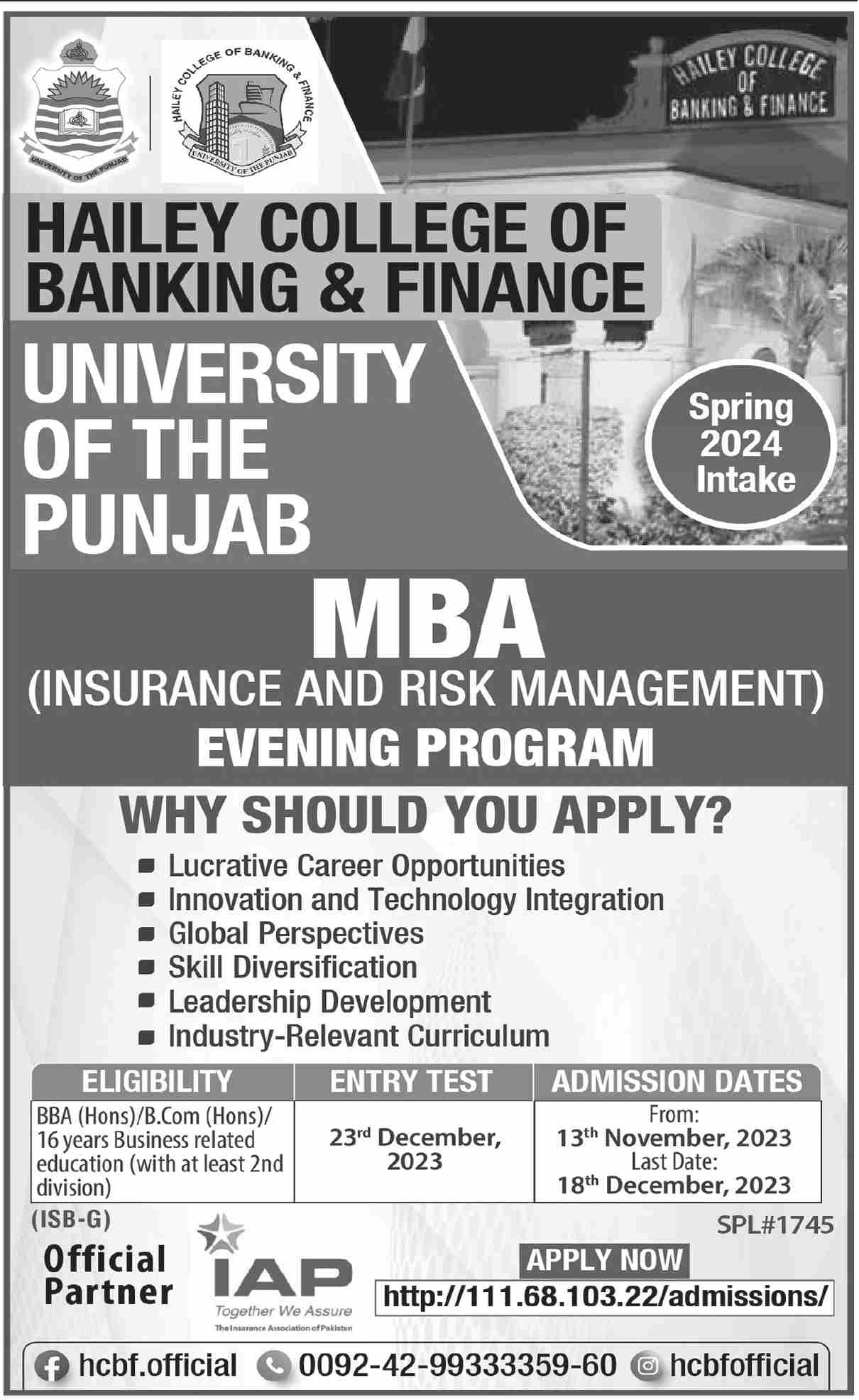 Are you ready to embark on a transformative journey towards a rewarding career in finance? Look no further than Hailey College of Banking & Finance, a prestigious institution affiliated with the University of the Punjab. Admissions are now open for the Spring 2024 intake, specifically for the MBA program in Insurance and Risk Management, an evening program designed to cater to the needs of working professionals.