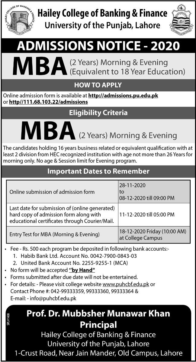 Hailey College of Banking & Finance, University of The Punjab invites the application forms of admission for MBA (2 years) in Lahore. The last date for submission of application forms is 11 December 2020.