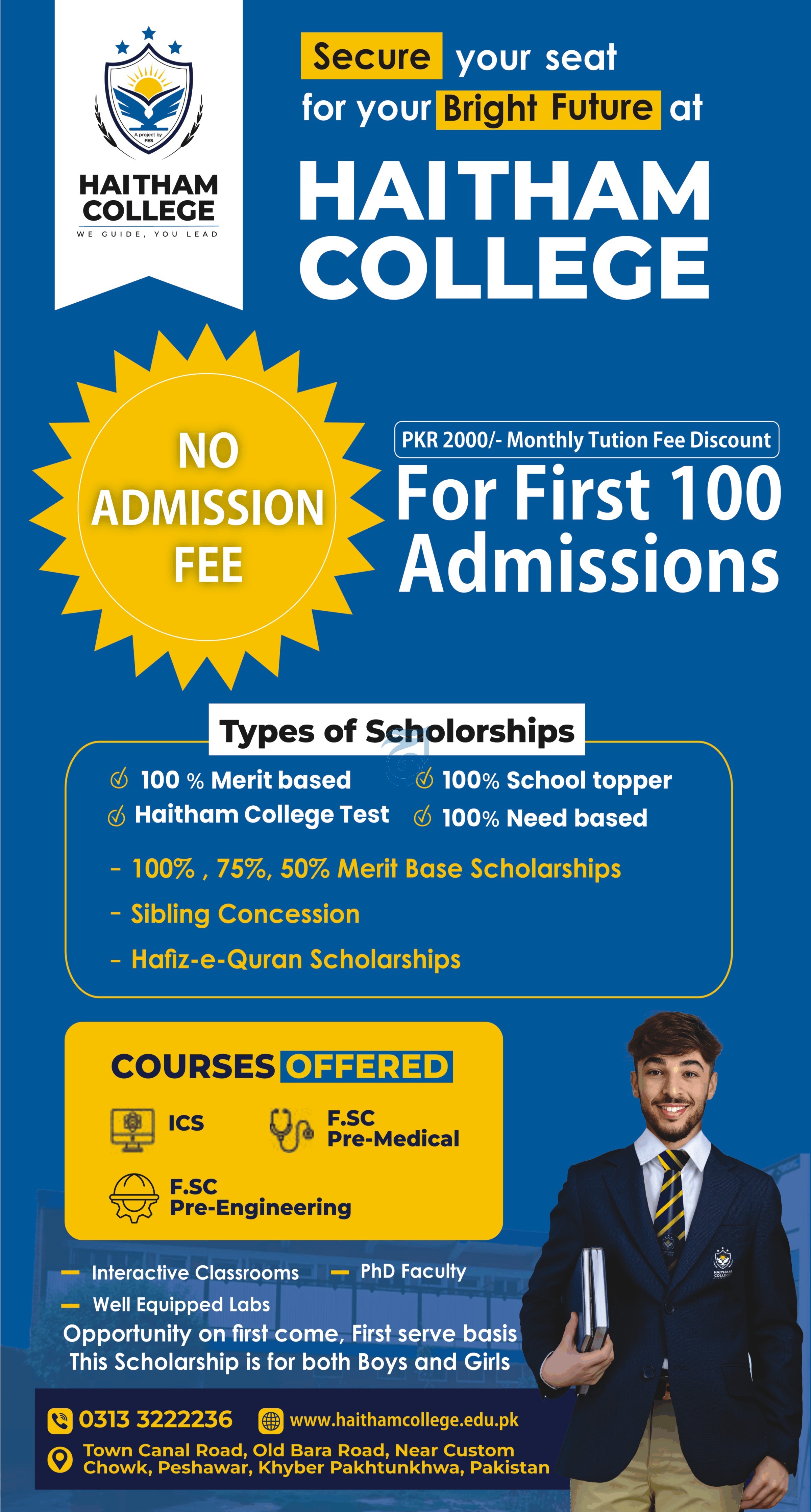 For a limited time, Haitham College is offering PKR 2000/- Monthly Tuition Fee Discount for the first 100 admissions. This offer is designed to make quality education more accessible to students and ease the financial burden on families. The admissions process is already underway, and seats are available on a first-come, first-served basis. So, don’t miss out on this incredible opportunity to secure your seat at Haitham College.