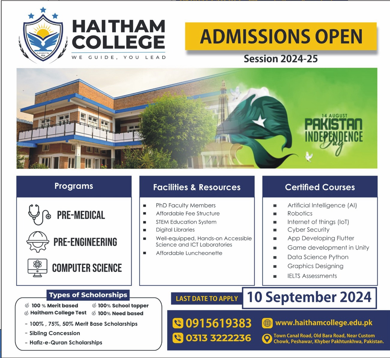 Haitham College Peshawar is now accepting applications for its Admissions 2024 for FSC and ICS programs. This prestigious institution offers a range of courses designed to prepare students for higher education and future careers in various fields.