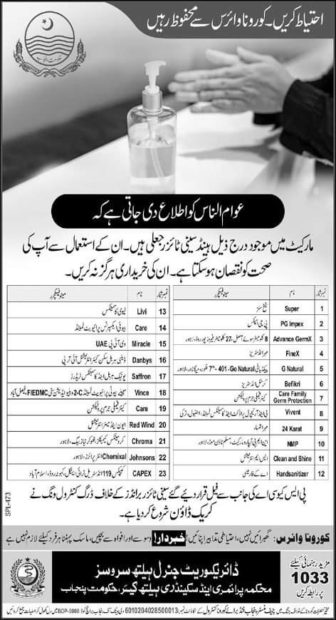 Many hand sanitizers in Pakistan are fake because these are not as per international standards and does not save you from these Germs including Coronavirus or COVID 19. So Directorate General Health Services, Primary and Secondary Health care, Government of Punjab has warned the public from these fake Hand Sanitizers in Pakistan, which are not only looting people by high prices and are not able to disinfect from germs.