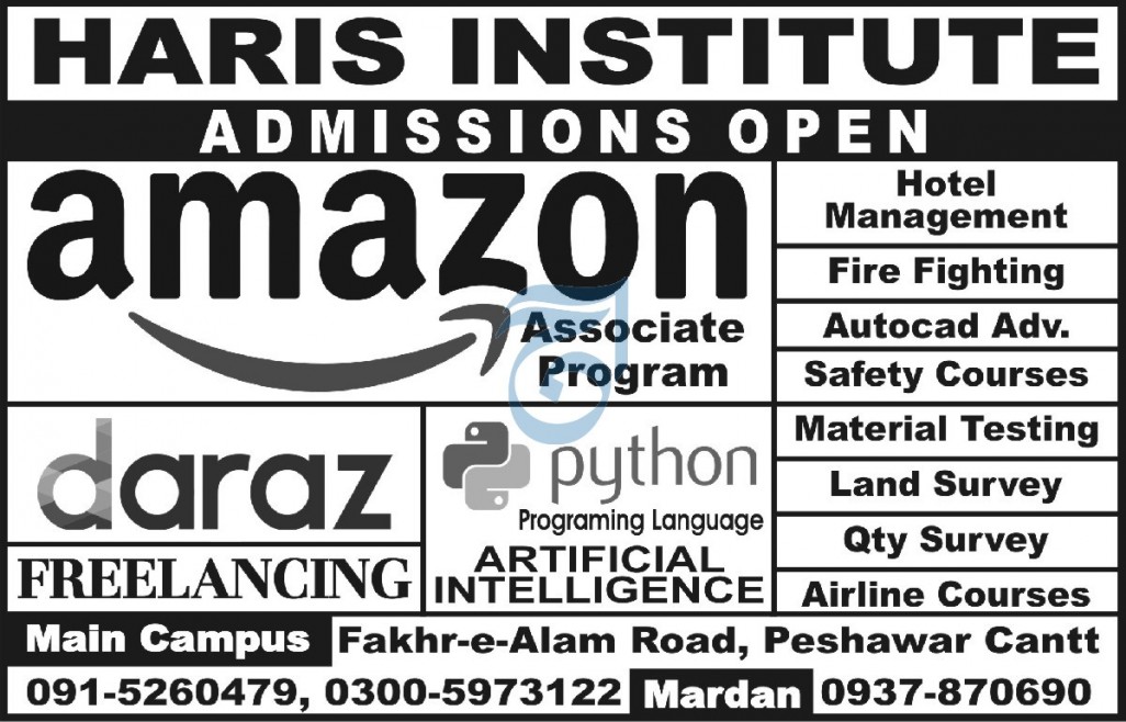 Haris Institute has announced the admissions 2020 in Associate Program of Hotel Management, Fire Fighting, AUTOCAD, Safety Courses, Material Testing, Land Survey, Airline Courses in Peshawar Cantt.