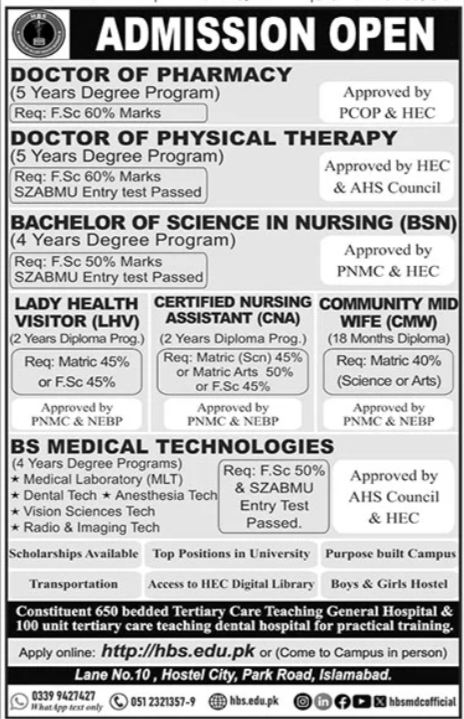 HBS Medical & Dental College Islamabad — a constituent institution affiliated with Shaheed Zulfiqar Ali Bhutto Medical University SZABMU and approved by HEC, PCOP, AHS Council, PNMC, and NEBP — proudly announces Admissions Open for the Academic Session 2025–2026 in various undergraduate and diploma programs.