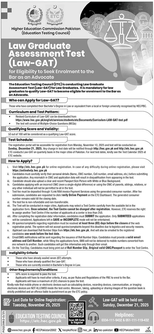 The Higher Education Commission HEC Pakistan, through its Education Testing Council ETC, is conducting the Law Graduate Assessment Test Law-GAT for law graduates. Law-GAT is mandatory for law graduates seeking enrolment to the Bar as an Advocate.