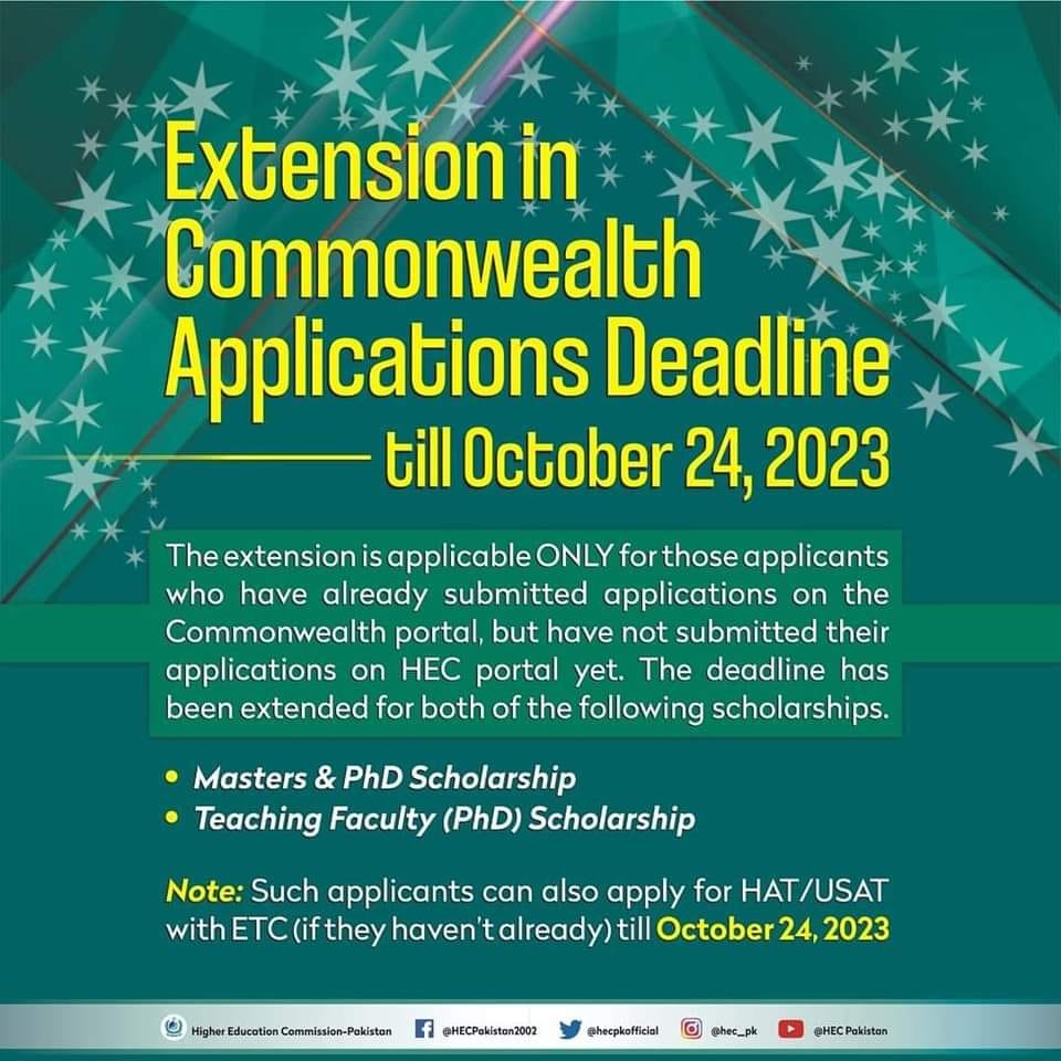 If you fall into this category and have already submitted your applications on the Commonwealth portal but have yet to send them through the HEC portal, theres good news for you. HEC has announced that HEC Extends Commonwealth Scholarships 2023 Application Target Date.