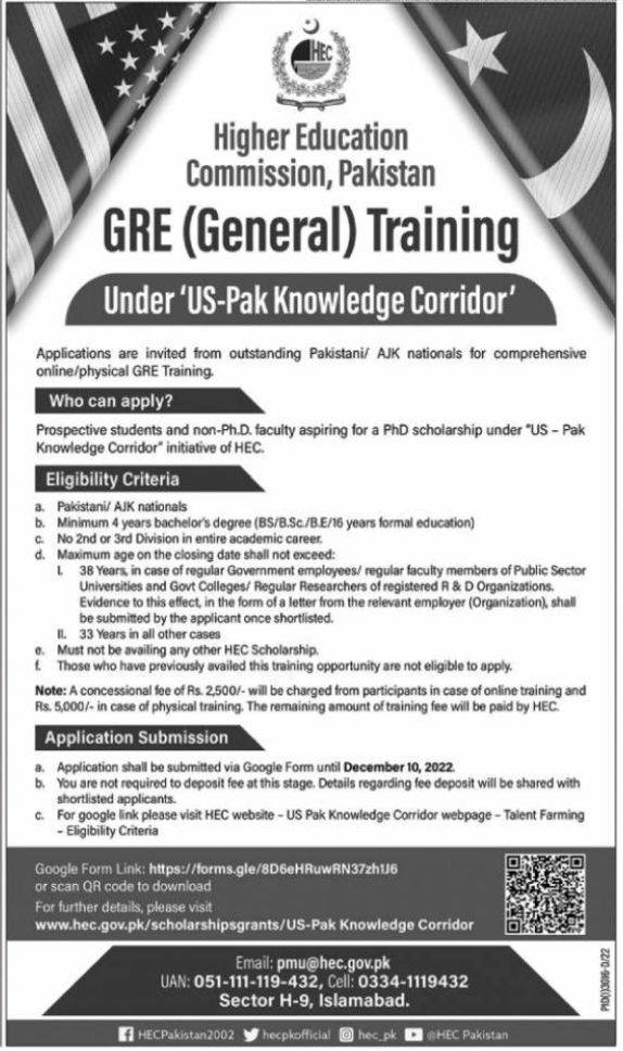 Higher Education Commission invited the applications from the outstanding Pakistani and AJK nationals to get the comprehensive online and physical GRE training. The candidates, who are the prospective students and non-PhD and they seek scholarships under ‘US-Pak Knowledge Corridor” initiative of HEC, they can submit their application forms online for HEC GRE General Training 2022 by the final date of 10-12-2022. The candidates will note the eligibility criteria and they must have at least bachelor degree of 4 years and there may not be a 2nd or 3rd division in the entire academic career and they must have maximum 38 years of age in case of government employees or regular faculty member of the public universities or government college or the regular researchers of registered R&D organizations. The candidates must have maximum age limit of 33 years in all other cases and they should ensure that they will follow the instructions at the time of applying for this training.