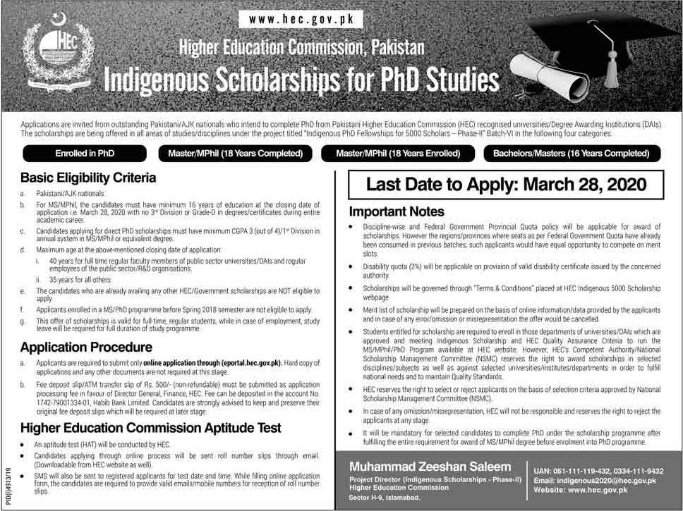 The Higher Education Commission HEC, Islamabad invites applications from eligible Pakistani & AJK national for HEC Indigenous PhD Scholarships 2020. The candidates HEC recognized universities and degree awarding institutions who want to complete their Doctorate studies can apply for the HEC PhD “Fellowships for 5000 Scholars- Phase II” Batch VI in the categories like Enrolled in PhD, Master/M.Phil (18 Years Completed), Master/M.phil (18 Years Enrolled), and Bachelor Masters (16 Years Completed. The HEC will conduct an Aptitude Test (HAT) for PhD Scholarship Program 2020 and the last date to apply online is up to 28-03-2020.