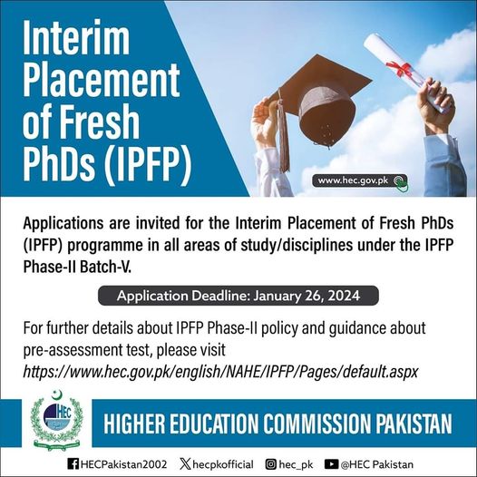 Higher Education Commission of Pakistan has announced the Interim Placement of Fresh PhDs IPFP program in all areas of study / disciplines under the IPFP phase-II Batch V. the interested candidates are asked to forward their application forms for their interim placement under their HEC IPFP Phase II Batch V Application Schedule 2023.