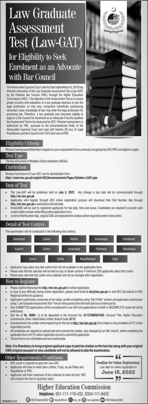 Islamabad, Higher Education Commission Islamabad is going to manage the Law Graduate Assessment Test 2022 for the candidates, who have passed their Law graduation and they seek enrolment with Bar Councils. The candidates will follow HEC Law-GAT Enrolment as Advocate with Bar Council Test Schedule 2022 and they will download their forms for revised curriculum of Law-GAT to appear in the test. The candidates, who have passed their LLB degree or equivalent from any university, which is recognized by HEC, they can be eligible to apply for the test. The Law-GAT test will consist of the multiple choice questions, which will be held on 03-07-2022 in the test centers located at Islamabad, Lahore, Multan, Bahawalpur, Faisalabad, Karachi, Sukkur, Hyderabad, Peshawar, Abbottabad, Turbat, Quetta, Muzaffarabad and Gilgit. The candidates can apply for the registration by the final date of 15-06-2022 and they will also read the instructions, which are mentioned in the notification.