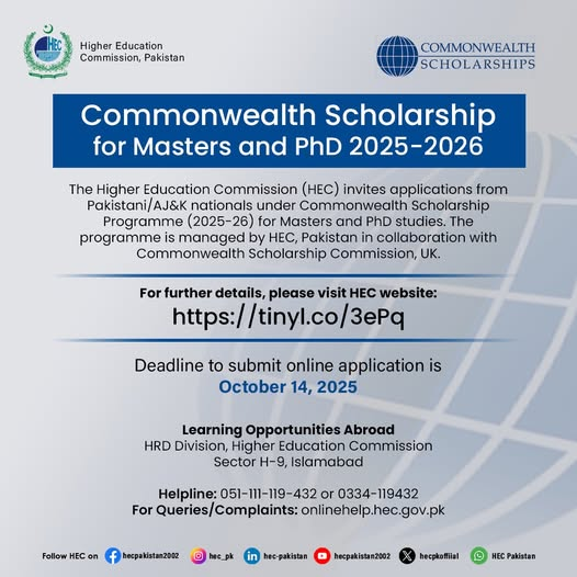 Higher Education Commission has announced the Commonwealth scholarships for the students, who want to get admission in the Masters and PhD programs. Pakistani and the citizens of AJK are eligible to apply for the scholarship to pursue the education at the postgraduate and doctorate level education. The students can get the latest updates of HEC Masters & PhD Commonwealth Scholarships 2025-26.