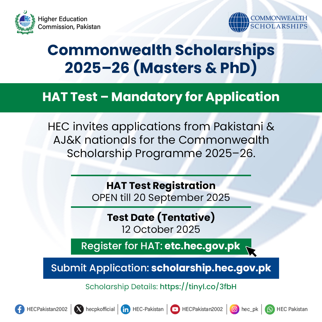 The desired candidates can submit their application forms online on the official website of HEC. The candidates will have to pass the HAT test and the registration for the HAT is started, which will be continued till 20-09-2025. The HEC will conduct the HAT test for the Commonwealth Scholarships on 12-10-2025.