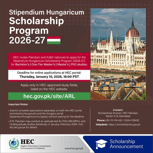 Higher Education Commission of Pakistan has announced the leading scholarship program for the undergraduate, MS, MPhil and PhD programs. The students can get the latest updates that HEC Offers Stipendium Hungaricum Scholarship Program 2026-27 and they can get the detailed information of this scholarship program in their respective fields. The candidates are advised to apply in the approved study fields of HEC, which are listed on the website of HEC.