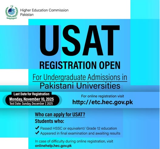 The last date to register for the USAT 2025 is Monday, November 10, 2025, while the test will be conducted nationwide on Sunday, December 7, 2025. Interested students can complete their registration process online through the HEC Education Testing Council portal at etc.hec.gov.pk.