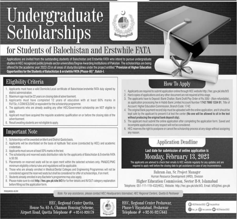 Higher Education Commission HEC is pleased to announce undergraduate scholarships for students residing in the coastal regions of Balochistan. This initiative is designed to support exceptional students from the districts of Gwadar, Lasbela/Hub, Kech Turbat, and Awaran in Balochistan who aspire to pursue undergraduate studies at HEC-recognized public or private sector universities and degree-awarding institutions DAIs across Pakistan. These scholarships encompass all areas of study and disciplines, falling under the project titled, "Coastal Region Higher Education Scholarship Programme for Balochistan." The students can get the detailed information regarding HEC Scholarships for Balochistan coastal regions.