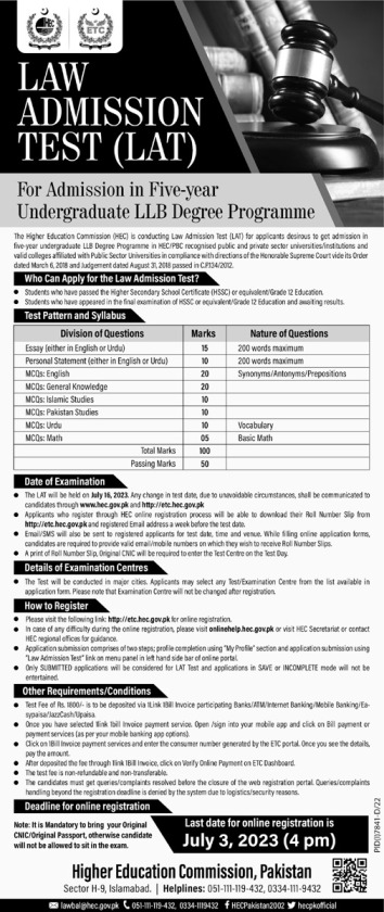 The Law Admission Test LAT is mandatory for admission to LLB programs in both government and private universities, as well as their affiliated colleges. The HEC Law Admission Test will be held tentatively in July, and the exact date will be communicated through the official website. Applicants who have successfully registered online will be able to download their Roll Number Slips online from the official website of the HEC one week before the examination date. The candidates can get the latest updates of their HEC Starts Law Admission Test LAT 2023 Registration.
