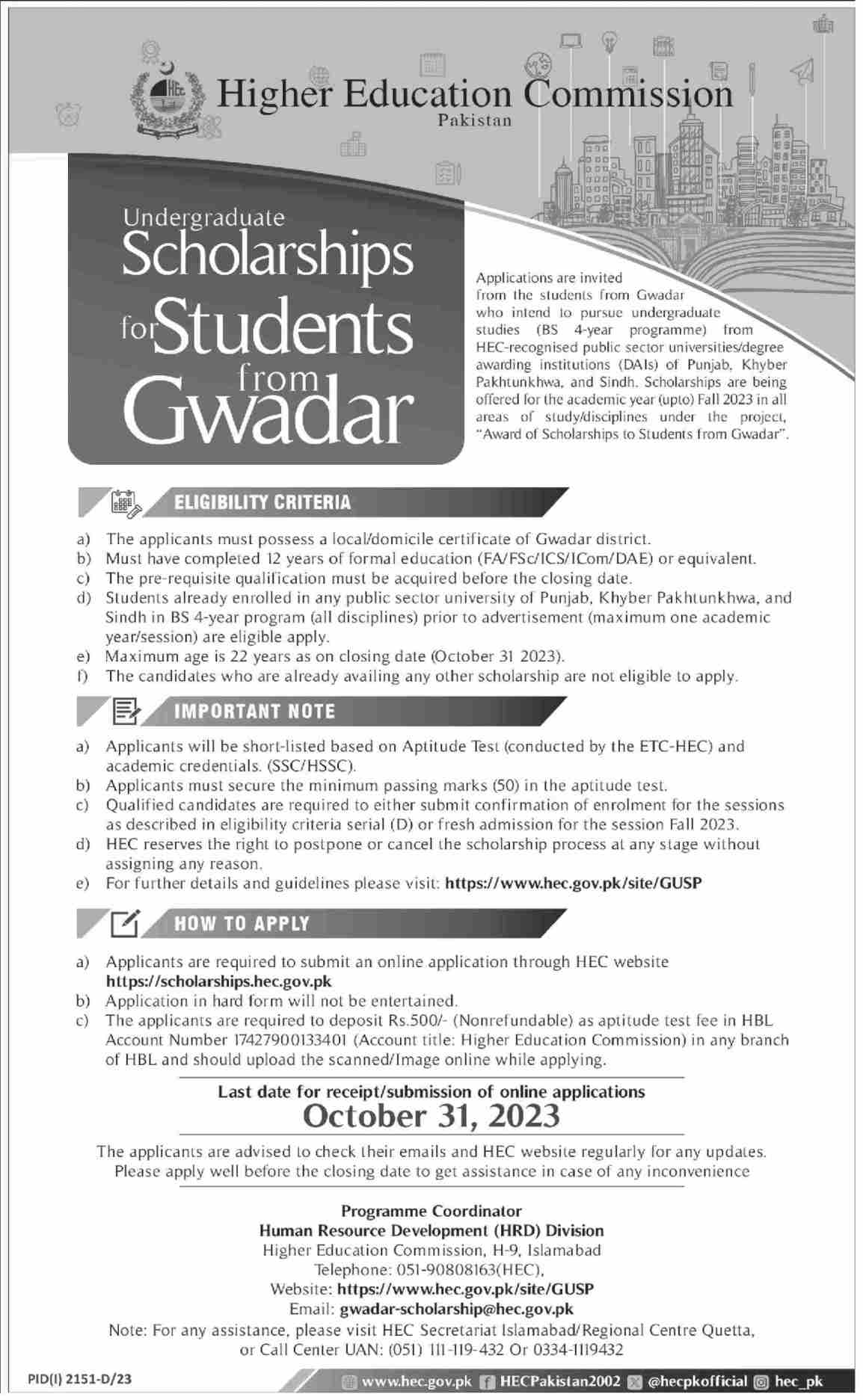 Higher Education Commission Islamabad is delighted to announce an undergraduate scholarship program tailored specifically for students from Gwadar. This initiative aims to support the education of deserving individuals from the region. Interested candidates can apply online through the HEC website. The scholarship covers various expenses, including tuition fees, hostel fees, and additional charges, while also providing a monthly stipend of PKR 6,000. The application deadline for this opportunity is October 31, 2023. The students can get information that HEC Offers Scholarship Opportunity to Gwadar Students.