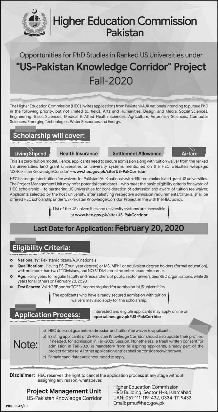 You Can HEC US Knowledge Corridor Scholarship 2020 Advertisement Here: