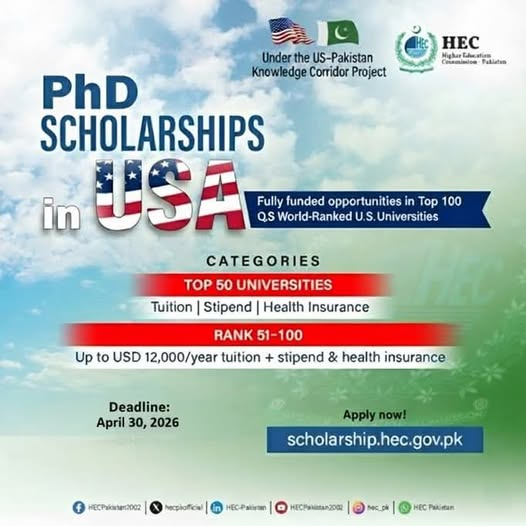 The Higher Education Commission has officially invited applications for fully funded PhD scholarships in the United States under the prestigious US-Pakistan Knowledge Corridor Project. Announced on April 21, 2026, this high-value opportunity targets aspiring scholars aiming to study at Top 100 QS World-Ranked U.S. universities. With a fast-approaching deadline of April 30, 2026, the HEC Pakistan initiative is designed to significantly increase the number of faculty members holding international doctorates, fostering a new era of research excellence within Pakistani academic institutions.