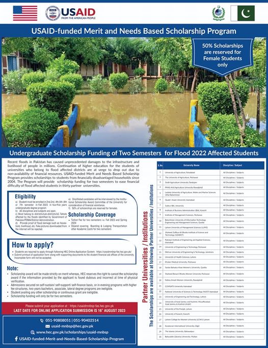 Higher Education Commission HEC is empowering financially disadvantaged female students through the USAID Merit and Need-Based Scholarship program MNBSP. This scholarship and financial aid initiative aims to support female candidates pursuing various degree programs in selected disciplines across 30 partner public and private universities. The candidates can get the detailed information regarding HEC USAID Need Based & Merit Scholarships to Empower Women.