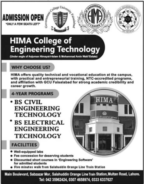HIMA College of Engineering & Technology, affiliated with Government College University GCU, Faisalabad, is now accepting applications for Fall Admissions 2025— but hurry, only a few seats are left!