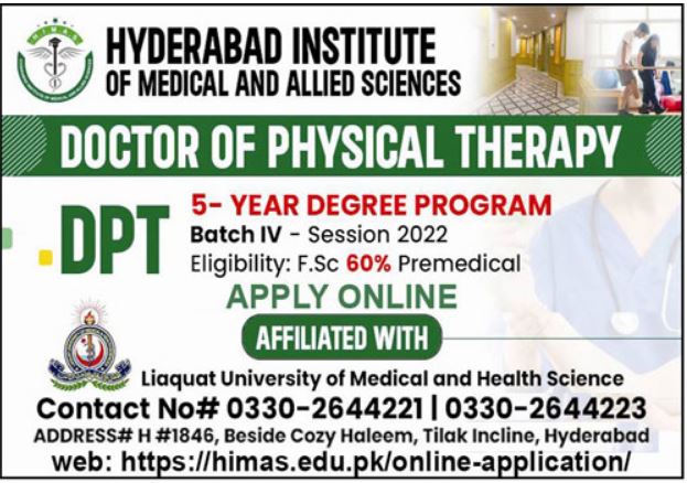 Hyderabad Institute of Medical and Allied sciences, Affiliated with University of Medical and Health Sciences is pursuing Interested Candidates to get enrolled in Hyderabad Institute of Medical and Allied sciences. Admissions are offering in DPT Doctor of Physical Therapy 5 Years Degree Program Batch-IV Session 2022. Candidates having FSc Pre-Medical Education with minimum 60% marks are eligible to apply.