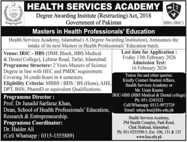Health Services Academy, Islamabad HSA has officially announced HSA Admissions 2026 for its prestigious Masters in Health Professionals Education program. As a degree-awarding institution under the Government of Pakistan, Health Services Academy offers a two-year MSc program aligned with HEC and PMDC requirements. The program covers 34 credit hours across four semesters and is designed to develop skilled health education professionals ready to make an impact in medical and allied fields.