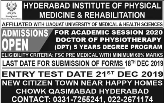 Hyderabad Institute of Physical Medicine & Rehabilitation has announced admissions for 5 year DPT Doctor of Physiotherapy. FSc Pre Medical with 60% marks students can apply. Last date for submission of admission applications is 18 Dec 2019. Entry Test will be held on 21 Dec 2019.