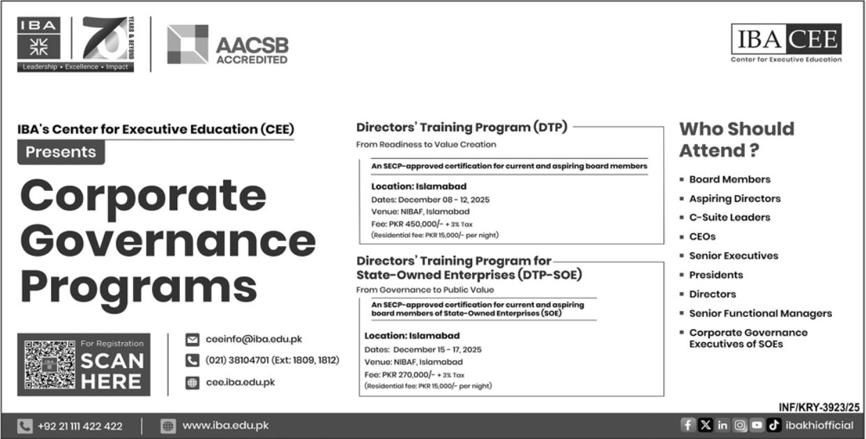 The Institute of Business Administration IBA Karachi, AACSB-accredited and a leader in executive education, is offering specialized Corporate Governance Programs through its Center for Executive Education CEE for professionals seeking to enhance their leadership and boardroom capabilities.