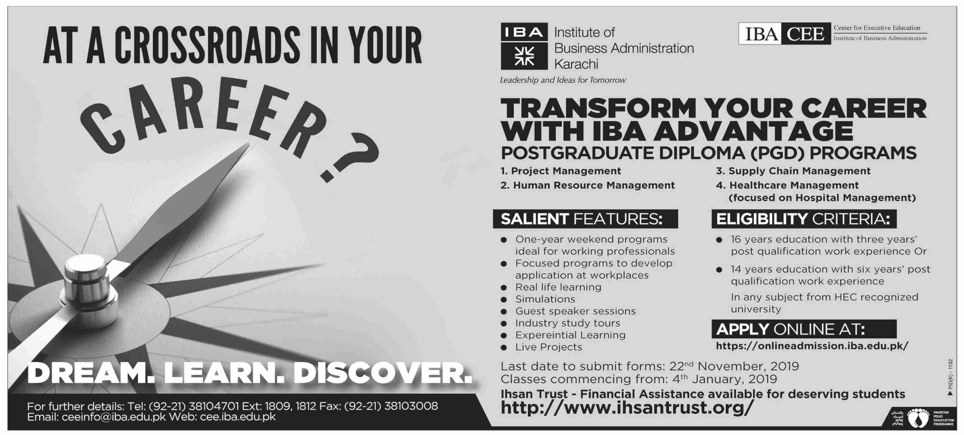 Karachi, Institute of Business Administration Karachi has offered admissions in Postgraduate Diploma PGDS Programs. IBA Offered Admissions in Project Management, Supply Chain Management, Human Resource Management and health Management.last date for submission of form is 22 November 2019.