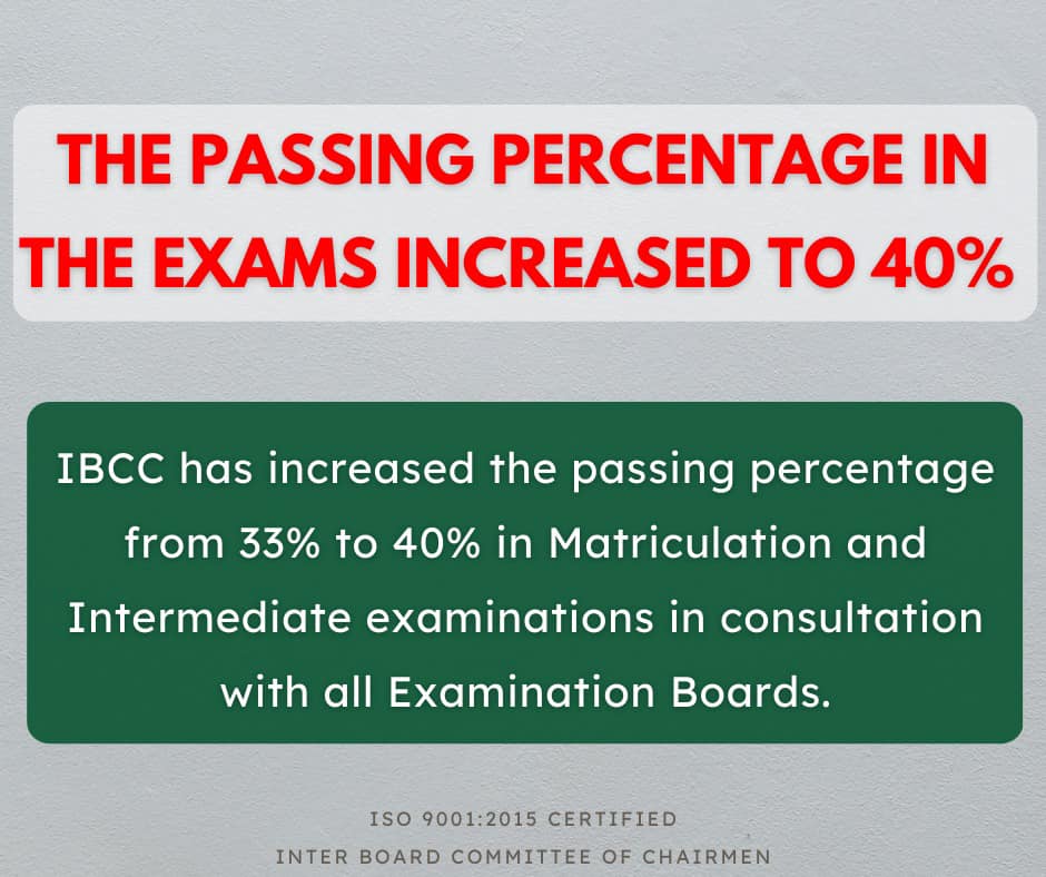Inter Board Committee of Chairmen has announced that the previous passing percentage of SSC and HSSC classes were 33%, which are now enhanced to 40%. The candidates can note the new development of passing marks as mentioned in IBCC Matric & Inter Passing Percentage Increase. IBCC has made this decision to increase the passing marks of Matric and Inter after consulting with all education board and in order to improve the level of education.