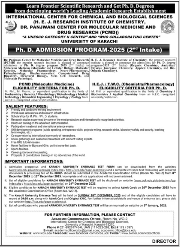 The International Center for Chemical and Biological Sciences ICCBS—comprising the H.E.J. Research Institute of Chemistry and the Dr. Panjwani Center for Molecular Medicine and Drug Research PCMD—announces the Ph.D. Admission Program 2025 2nd Intake. As one of the developing world’s most prestigious academic and research establishments, ICCBS provides world-class scientific training, cutting-edge research facilities, and mentorship from internationally recognized scientists.