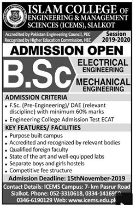 Islam College of Engineering & Management Sciences Sialkot has announced admissions for BSc in Electrical Engineering, Mechanical Engineering. FSc Pre Engg are eligible to apply. Last date for submission of admission applications is 15 Nov 2019.