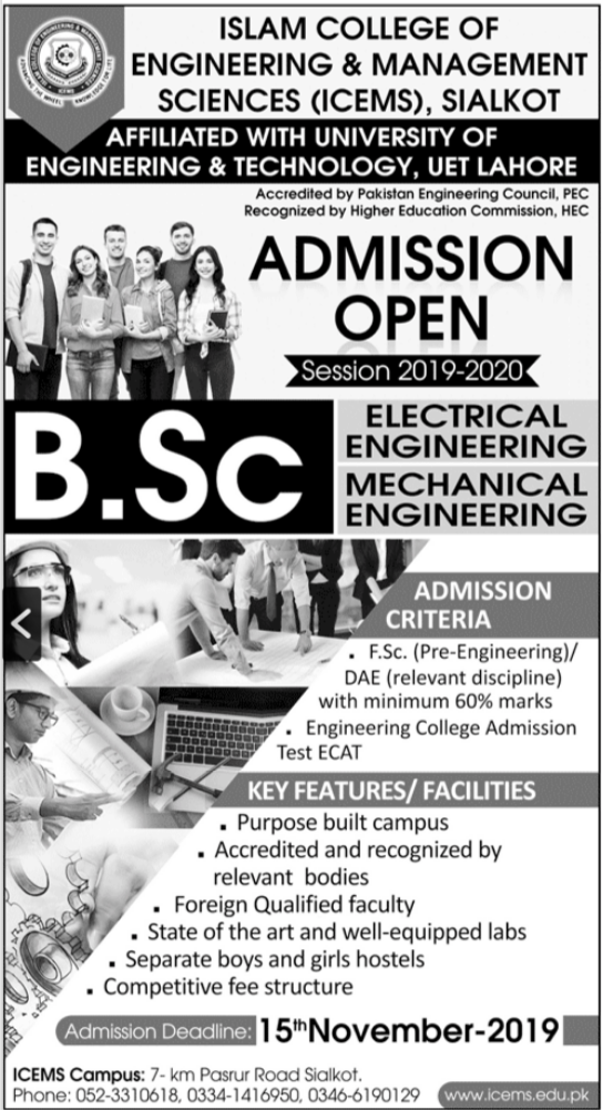 Islam College of Engineering & Management Sciences Sialkot has open admissions for BSc in Electrical Engineering, Mechanical Engineering. FSc Pre Engg are eligible to apply. Last date for submission of admission applications is 15 Nov 2019.