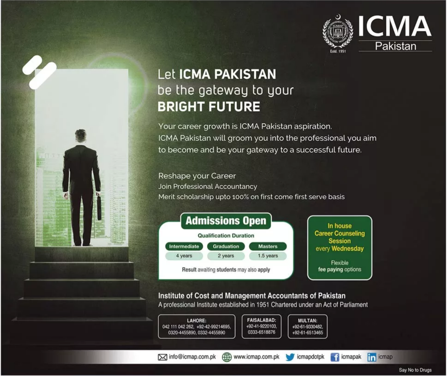 Institute of Cost & Managements Accountants of Pakistan has announced admission for Intermediate 4 years, Bachelor 2 years, Masters 1.5 years. Result awaiting students may also apply.