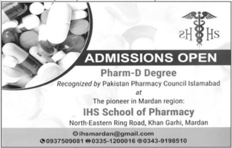 IHS School of Pharmacy Mardan is intend to open Admissions and accepting applications from desirous candidates for Admissions to Pharm-D Degree. Admissions are being offered for Academic Session 2021-2022. Pharm-D degree is recognized by Pakistan Pharmacy Council Islamabad. Candidates can apply now, admissions procedure is ongoing.