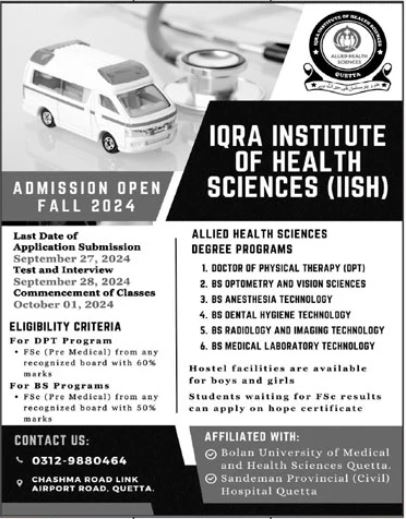 The Iqra Institute of Health Sciences IISH is excited to announce that admissions for Fall 2024 are now open! This is a prime opportunity for aspiring healthcare professionals to join one of the leading institutes in Quetta. With a strong commitment to academic excellence, IISH offers a range of Allied Health Sciences degree programs designed to equip students with the necessary skills and knowledge for successful careers in healthcare.