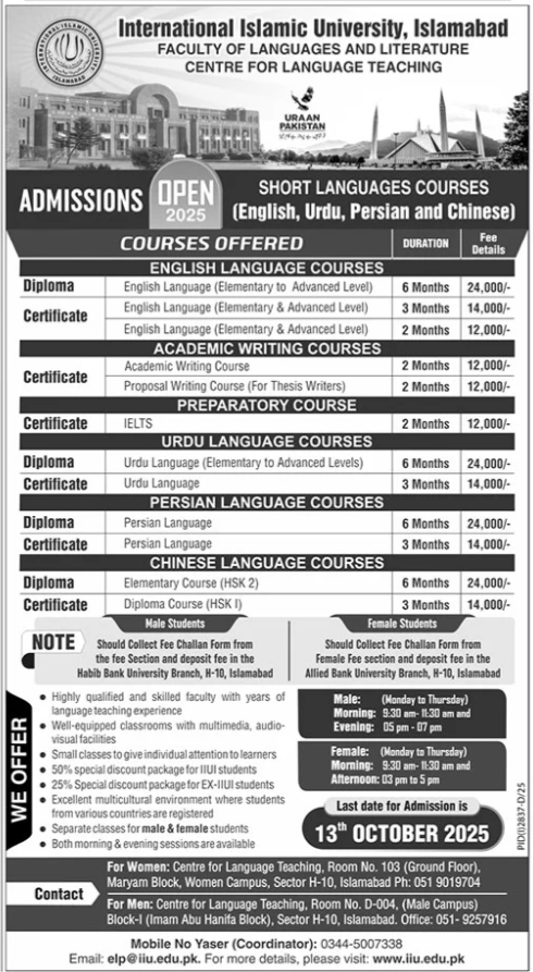 The Centre for Language Teaching CLT at IIUI is now accepting applications for Diploma and Certificate Courses in various languages for the Fall 2025 session. These short courses are designed to build communication skills, academic writing proficiency, and multilingual competence in a multicultural and supportive academic environment.
