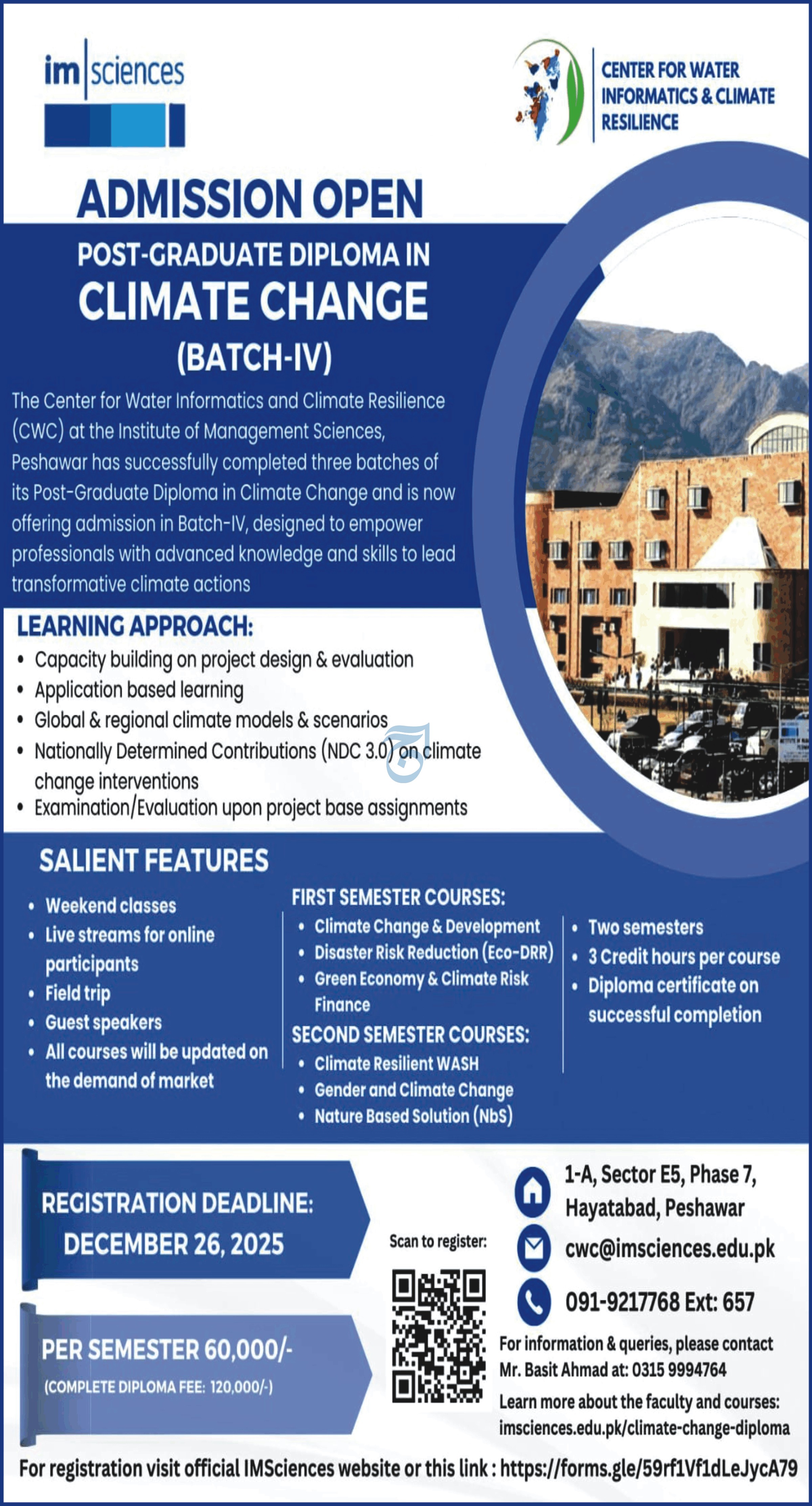 The Institute of Management Sciences IMSciences Peshawar has announced admissions for Batch-IV of its Post-Graduate Diploma in Climate Change, offered through the Center for Water Informatics and Climate Resilience CWC. After the successful completion of three batches, the program continues to equip professionals, researchers, and development practitioners with advanced knowledge and practical skills to address climate change challenges at local, national, and global levels.