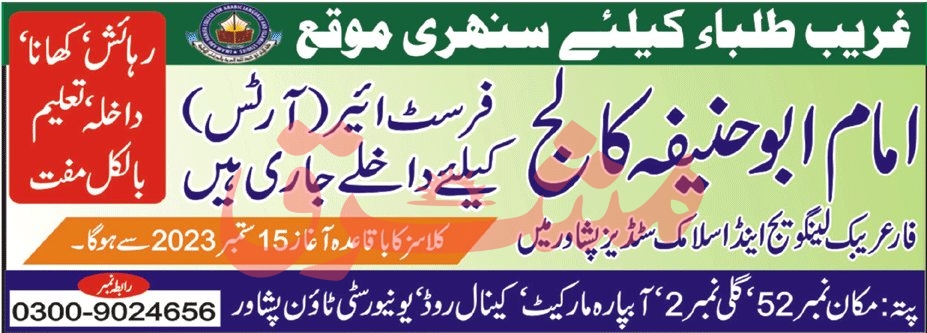 Peshawar, Pakistan – Imam Abu Hanfia College has announced its much-awaited admission for the fall 2023 session, bringing excellent news for aspiring students. Situated at House No. 52, Street No. 2, Apara Market, Kenal Road, University Town, Peshawar, this esteemed institution is offering a golden opportunity for first-year arts enthusiasts to pursue their dreams.