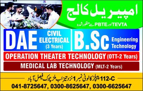 Imperial College Faisalabad announced admission for DAE 3 years in Civil Engineering, Electrical Engineering, B.Sc Engineering Technology, Operation Theater Technology 2 years, Medical Lab Technology 2 years.
