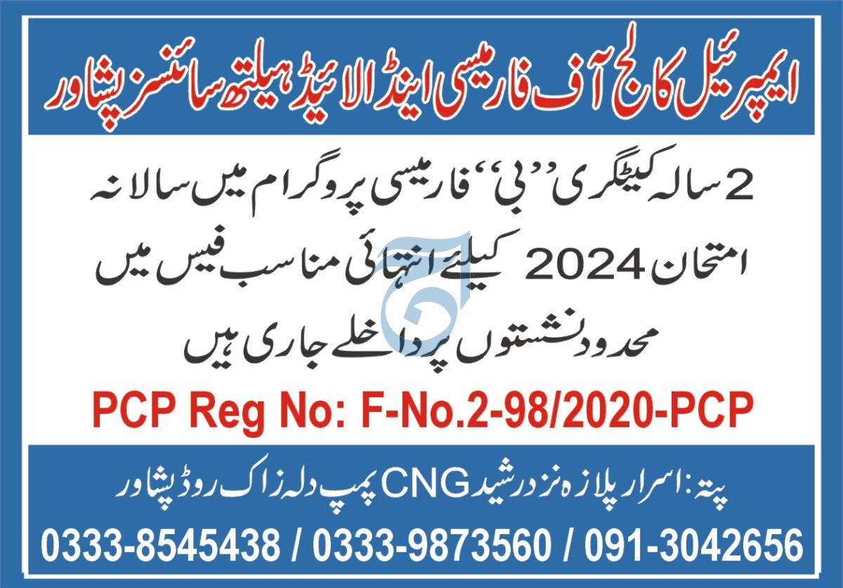 Peshawar, September 11, 2023 - Aspiring students in the field of pharmaceutical sciences have reason to rejoice as the Imperial College of Pharmacy announces admissions for the Fall 2023 intake. Situated in the heart of Peshawar, at Israr Plaza near the CNG pump on Dalazak Road, this prestigious institution offers a golden opportunity for those seeking excellence in pharmacy education.