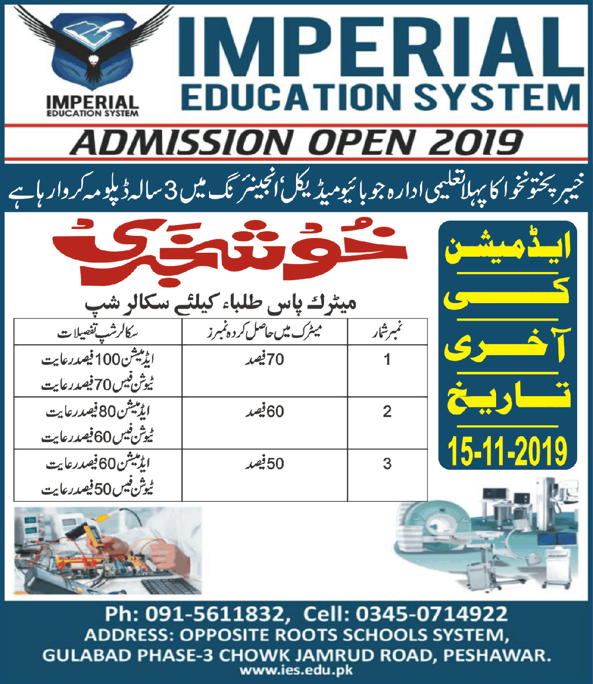 Imperial Education System Peshawar has offered admissions for DAE 3 Years in Biomedical Engineering. Scholarships are available. Last date for submission of admission applications is 15 Nov 2019.
