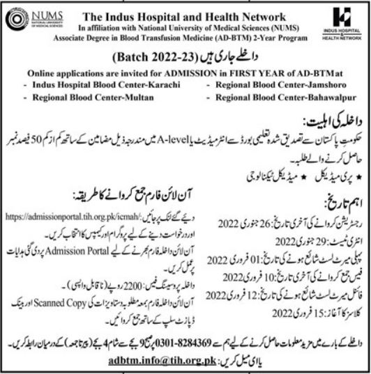 The Indus Hospital and Health Network Karachi inviting online applications to Aspirants in Admissions to First Year of AD-BTM at Indus Hospital Blood Center Karachi, Regional Blood Center-Jamshoro, Regional Blood Center Multan, Regional Blood Center Bahawalpur. Candidates passed Intermediate in Pre-Medical, Medical technology or A-Level students who got minimum 50% marks are eligible to apply. Last date for Registration is January 26, 2022. Entry Test will be held on January 29, 2022. First list will be displayed on February 01, 2022. Admissions are ongoing for Batch 2022-2023.