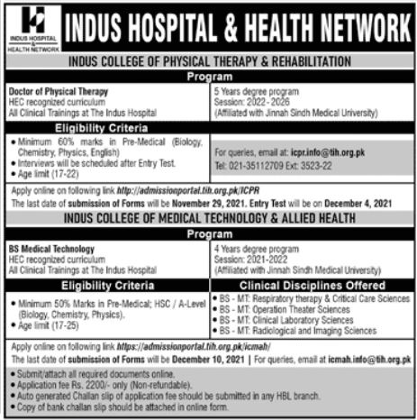 Indus Hospital & Health Network Karachi is decided to open Admissions and looking for Applications from interested candidates for Admissions to DPT Doctor of Physical Therapy, 5 years Program, for Session 2022-2026 in Indus College of Physical Therapy and Rehabilitation and Indus Hospital & Health Network Karachi offering Admissions in BS Medical Technology, 4 Years Degree Program, BS MT in Respiratory Therapy and Clinical Care Sciences, Operation Theater and Sciences, Clinical Laboratory Sciences, Radiological and Imaging Sciences for Session 2021-2022 in Indus College and Medical technology and Allied Health. Last date for submission of Applications is December 12, 2021. Admissions are open.