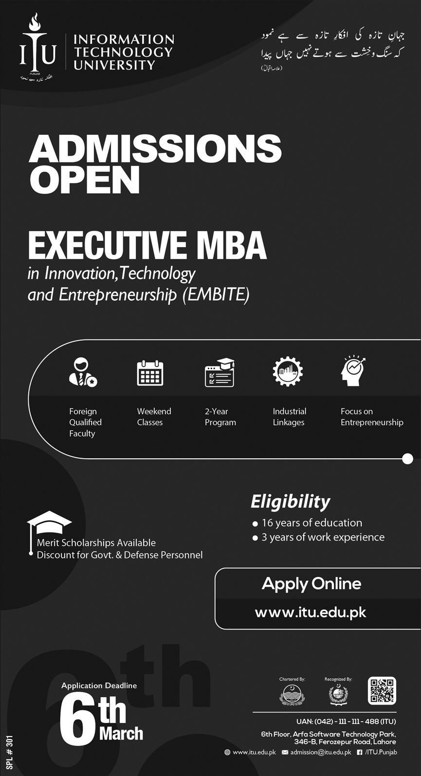 Information Technology University Admission 2020 announced for the class of Executive MBA. The Students can get their Admission from Online Apply.